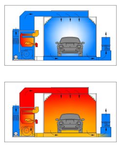 Sistema de recirculación de aire para recuperación del calor interior. Ahorro energético debido al sistema de recirculación. El uso de todo el caudal de aire en el ciclo de secado nos permite homogeneizar la temperatura en todo el interior. Gran capacidad para alcanzar la temperatura de secado.